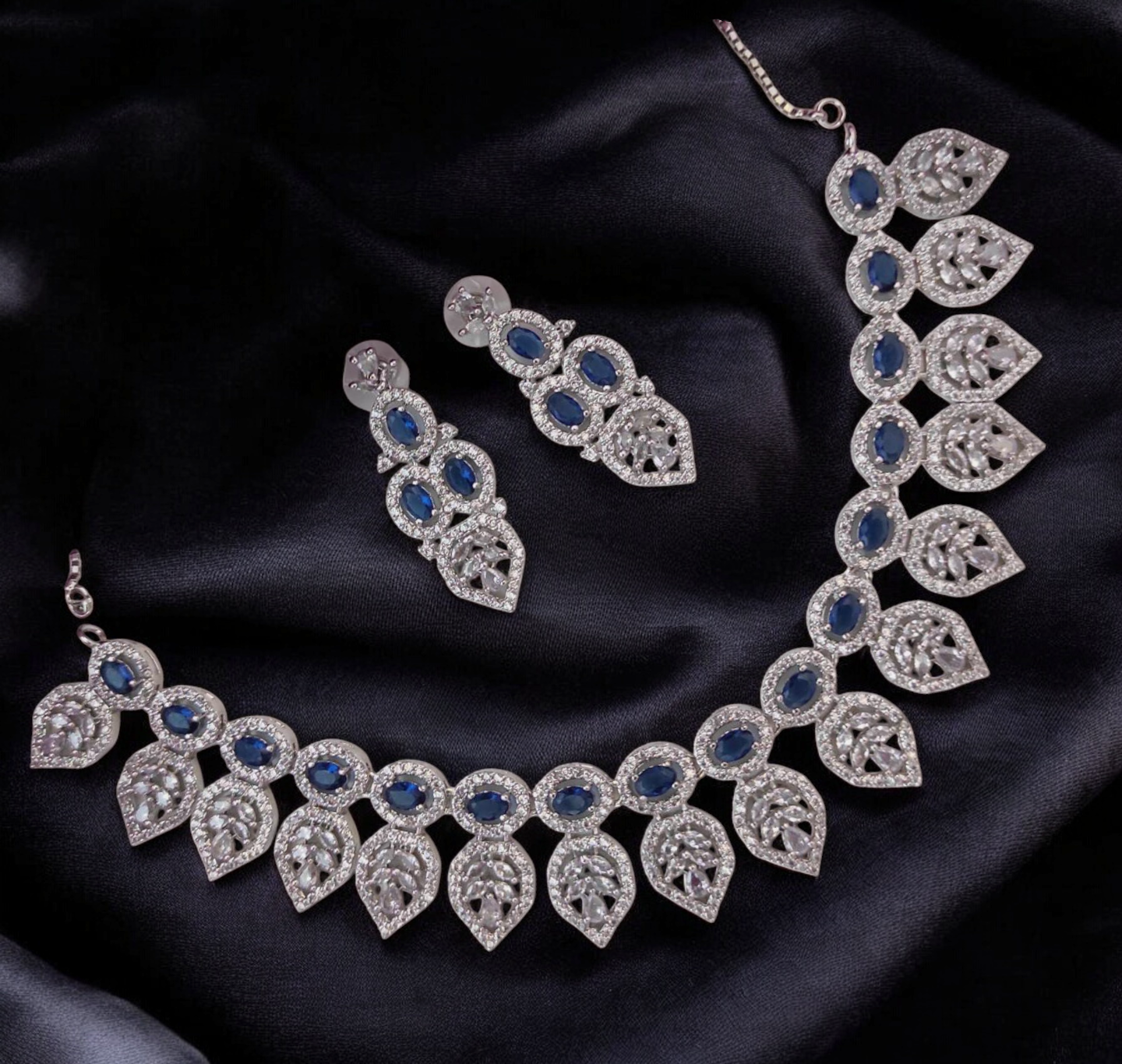 Leaf Motif American Diamond Necklace Set, Celebrity AD Jewellery Set, CZ Jewellery, Bridal AD Necklace, Wedding Choker Set, AD Earrings Set, AD Necklace, Indian AD Jewellery Set