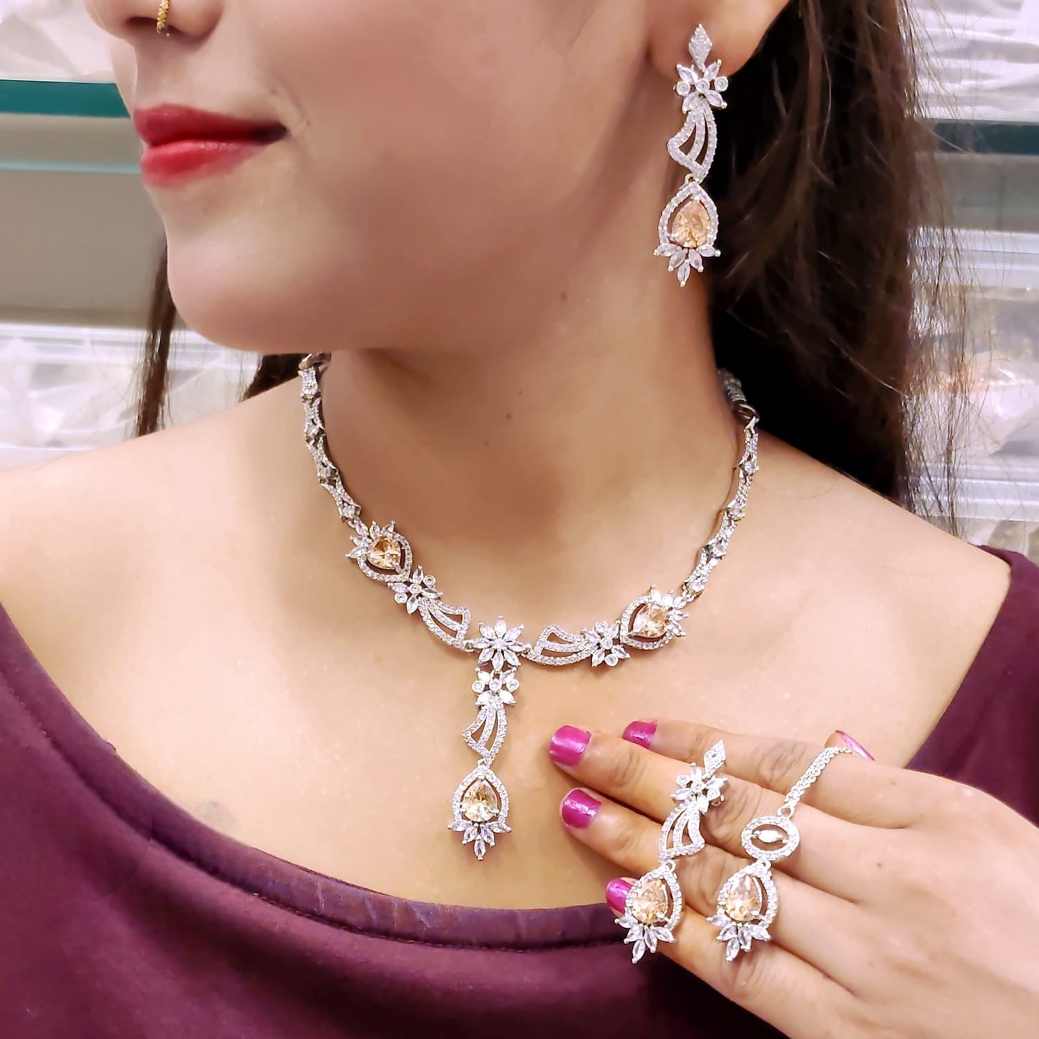 Make a bold and unforgettable statement with this exquisite Black Stone and Silver-Tone American Diamond Jewelry Set, designed to captivate and shine.