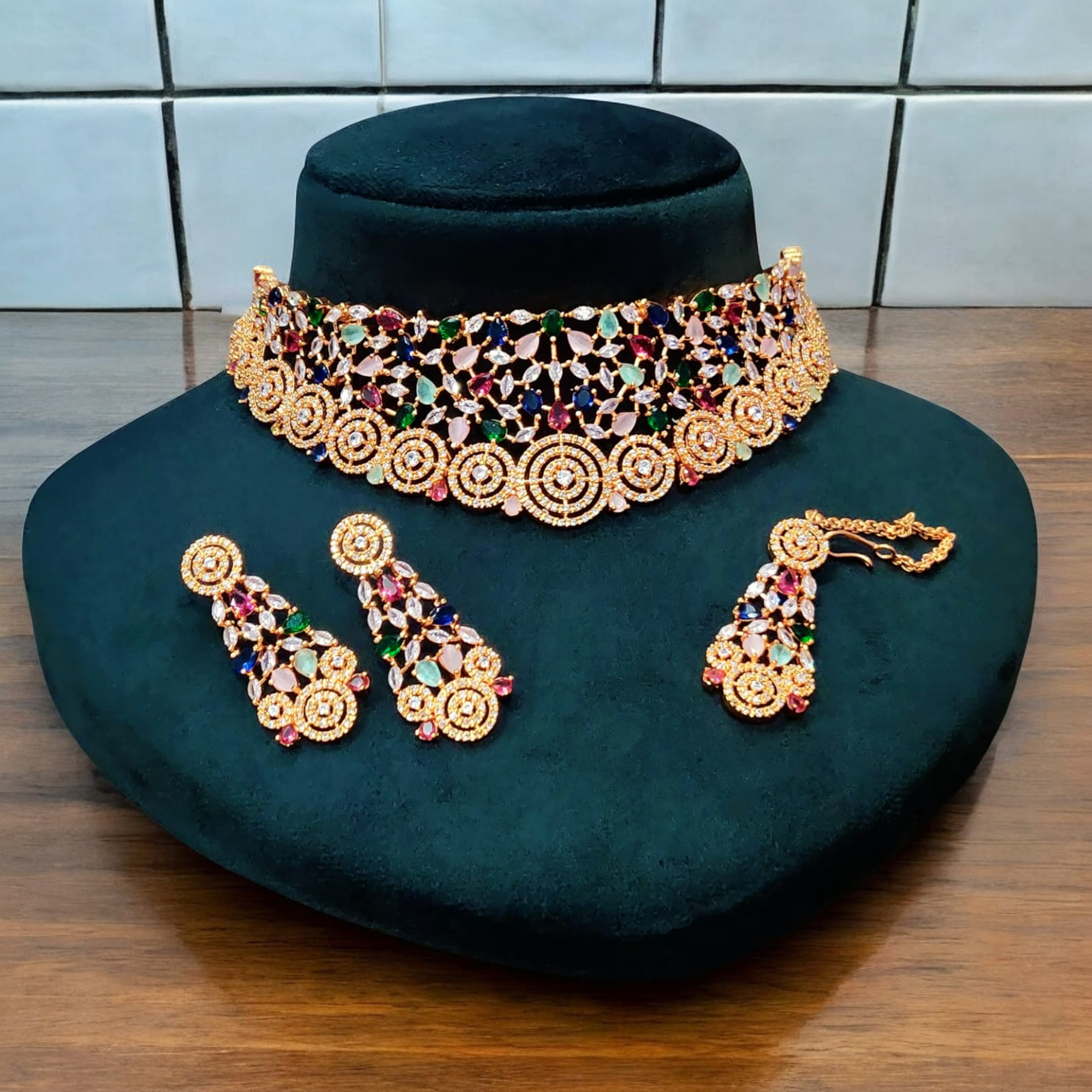 Pakistani Wedding CZ Choker AD Earrings Maangtika Set, Pakistani AD Jewellery Set, AD Jewellery Set, CZ Bridal Earrings Maangtika Set, AD Mangtika Choker Set, Bridal AD Jewelry