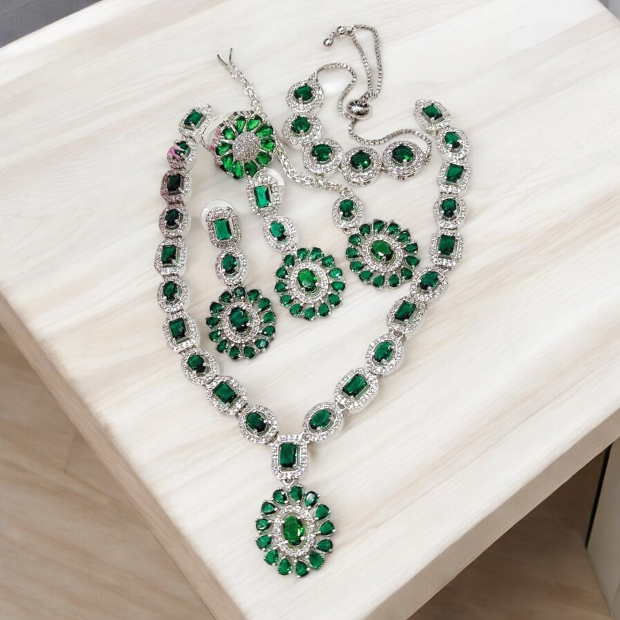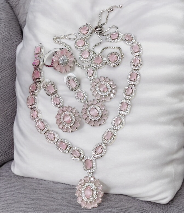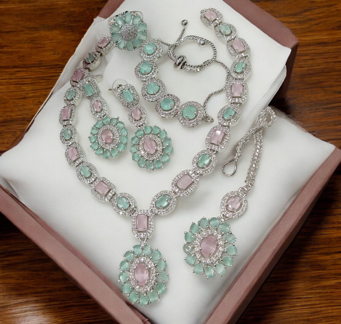 Sapphire AD Necklace Earrings Set With Maangtika Bracelet, Gemstone Bridal Jewelry, AD Necklace, CZ Mangtika