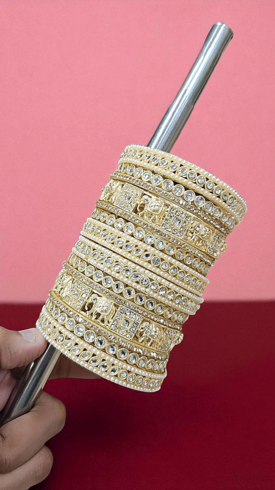 Step into royalty with this stunning Golden Kundan Bangles Set, intricately designed with elephant motifs, sparkling stone embellishments, and pearl detailing. These bangles exude traditional charm blended with modern elegance — perfect for brides, wedding guests, and festive occasions.