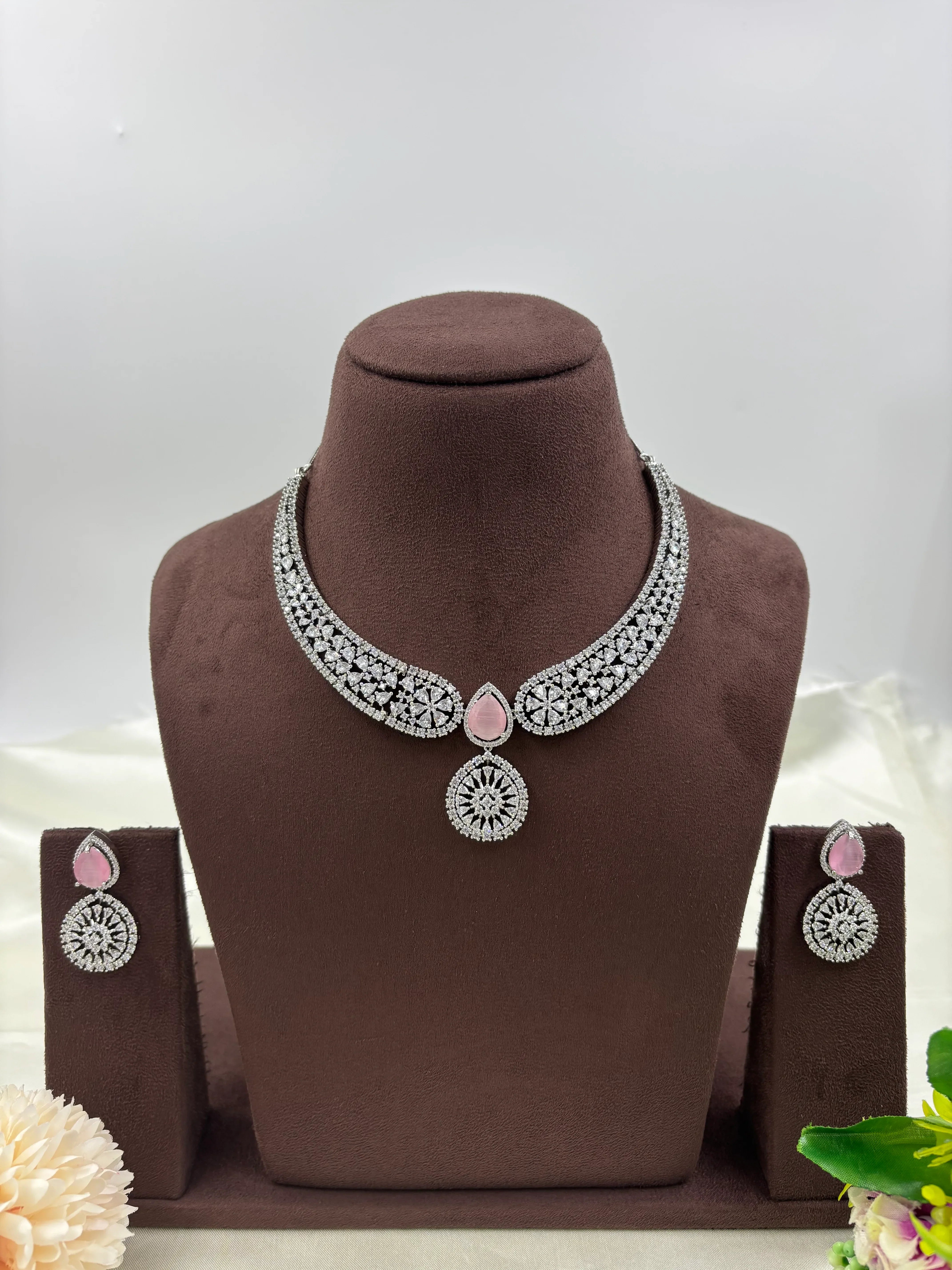Shine with timeless elegance in this stunning American Diamond Necklace Set. Crafted with precision, this set features sparkling American diamonds that add a luxurious touch to any outfit. Perfect for weddings, parties, and festive occasions, it comes with a beautifully designed necklace and matching earrings. A versatile piece that blends traditional charm with modern sophistication, making it a must-have for every jewelry collection.