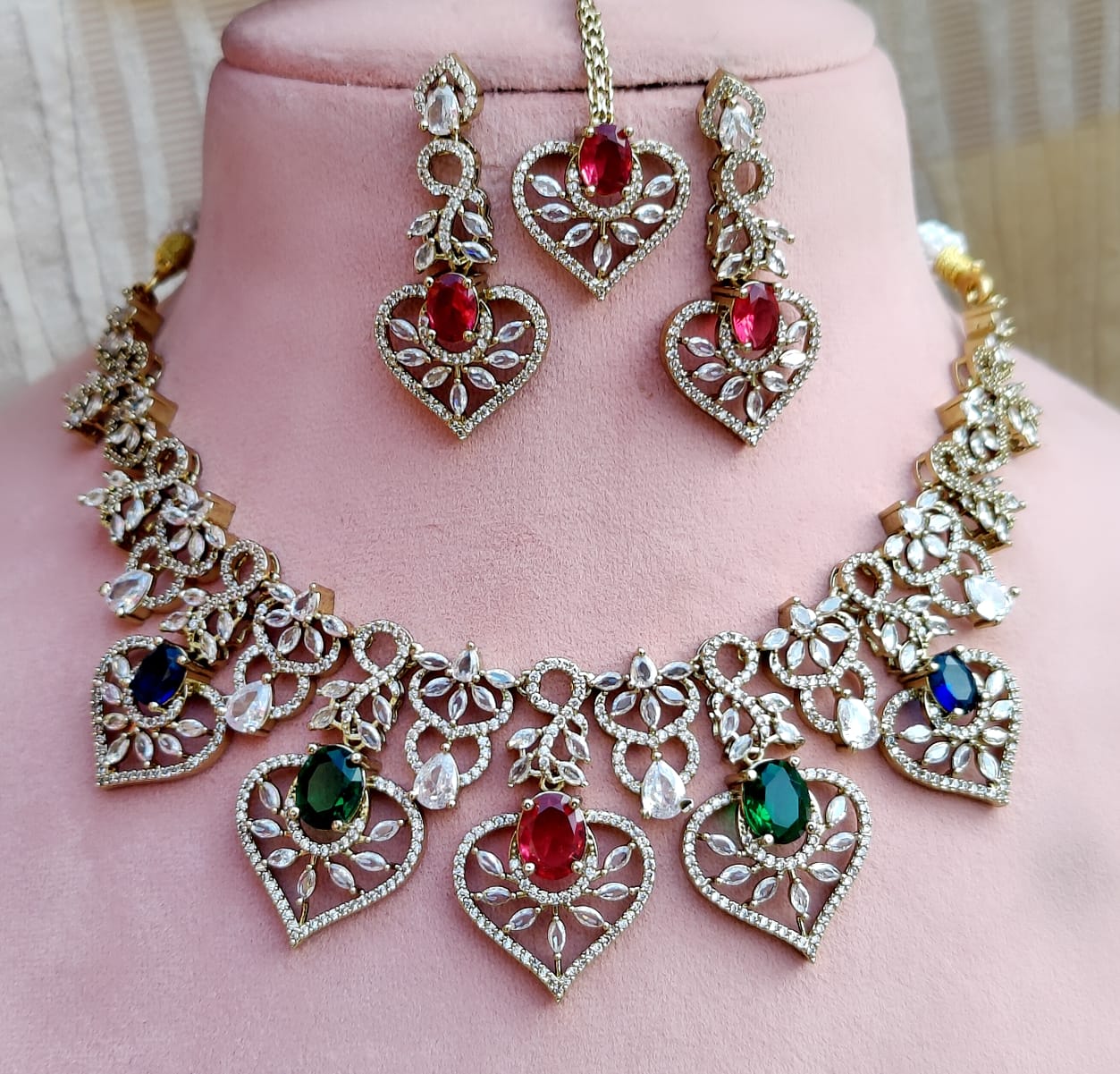 Diamond Stone Heart Necklace Set with Matching Earrings & Maang Tikka | Indian Jewellery Traditional Stone Indian Necklace Set