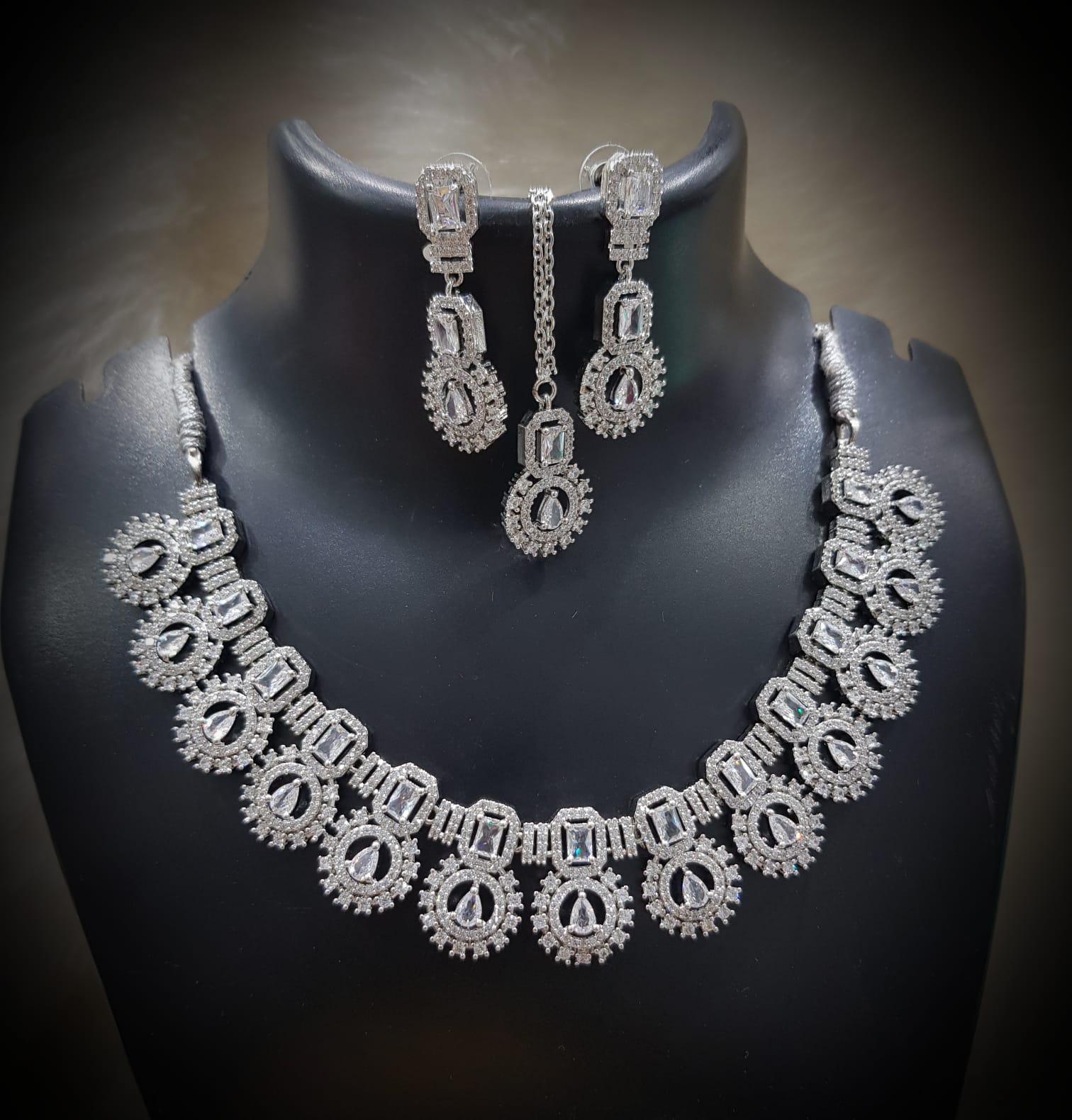 Add a touch of timeless elegance to your look with this Black Stone Gold-Plated Necklace Set, beautifully designed with shimmering white stones and bold black crystals. This complete 3-piece set includes a necklace, earrings, and maang tikka, making it the perfect choice for weddings, festive occasions, and special parties.Perfect for weddings, bridal wear, festive occasions, and parties, this jewelry set is crafted to enhance both traditional and modern outfits. The intricate detailing and premium gold finish ensure a regal look with unmatched sophistication.