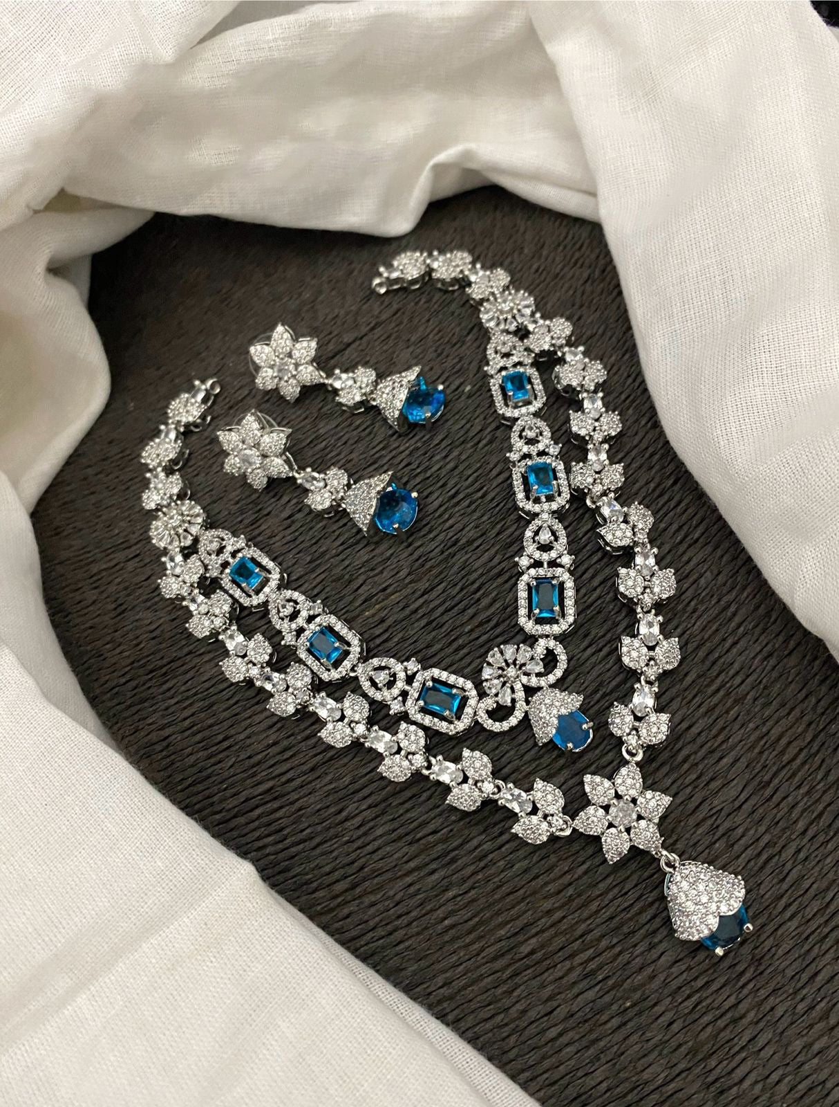 Enhance your wedding look with this exquisite Pakistani Double Layered Floral AD Necklace Earring Set For Wedding. Crafted with sparkling American diamonds and a beautiful double-layered floral design, this Pakistani Double Layered Floral AD Necklace Earring Set For Wedding is perfect for brides and wedding guests who want to make a statement. Add grace and charm to your special day with this elegant Pakistani Double Layered Floral AD Necklace Earring Set For Wedding, designed to complement both traditional and modern outfits.