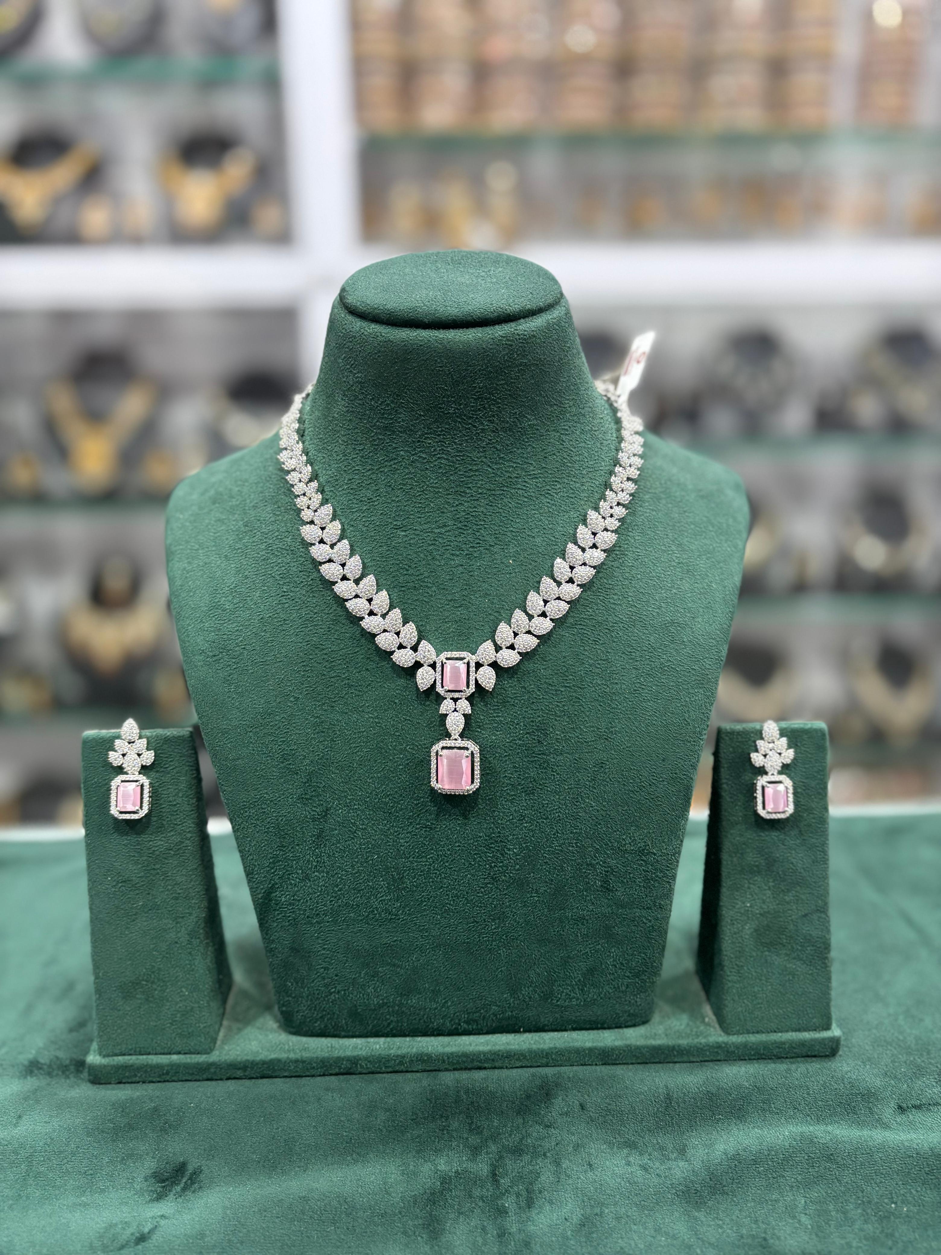 This Pink Pakistani Flower Design AD Necklace Earrings Set includes a beautifully crafted necklace and matching earrings that reflect timeless Pakistani craftsmanship. The shine and intricate floral design represent the grace and elegance of CZ Floral Pakistani Jewelry, perfect for making a bold yet graceful statement.