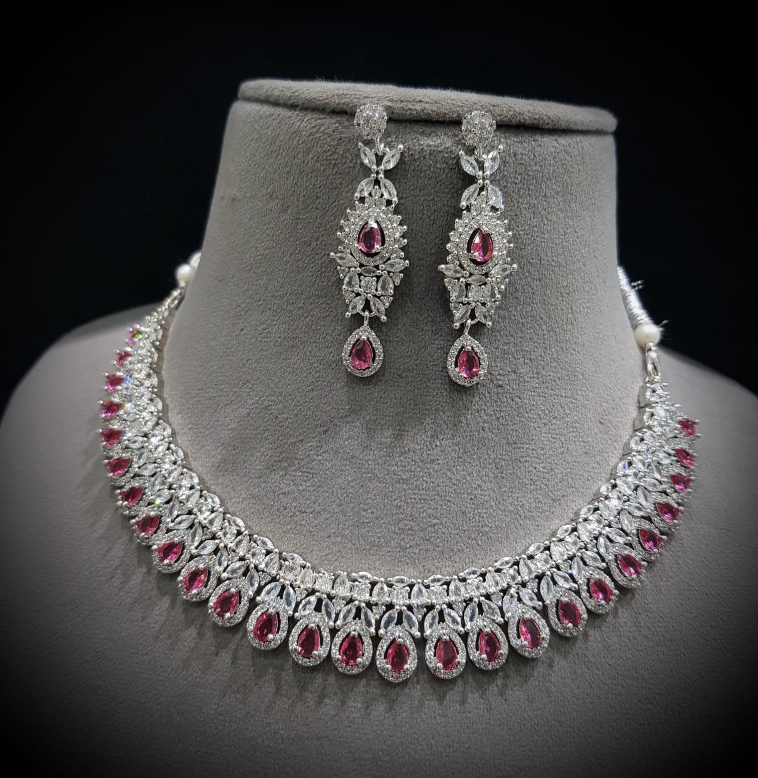 Celebrate your special moments with the dazzling charm of this Punjabi Silver Plated CZ Choker Earrings Set - CZ Jewelry Set. Designed with traditional Punjabi elegance, this set features a stunning silver-plated choker adorned with sparkling Cubic Zirconia stones, perfectly paired with matching earrings. The intricate craftsmanship and radiant shine make it ideal for weddings, parties, and festive occasions.