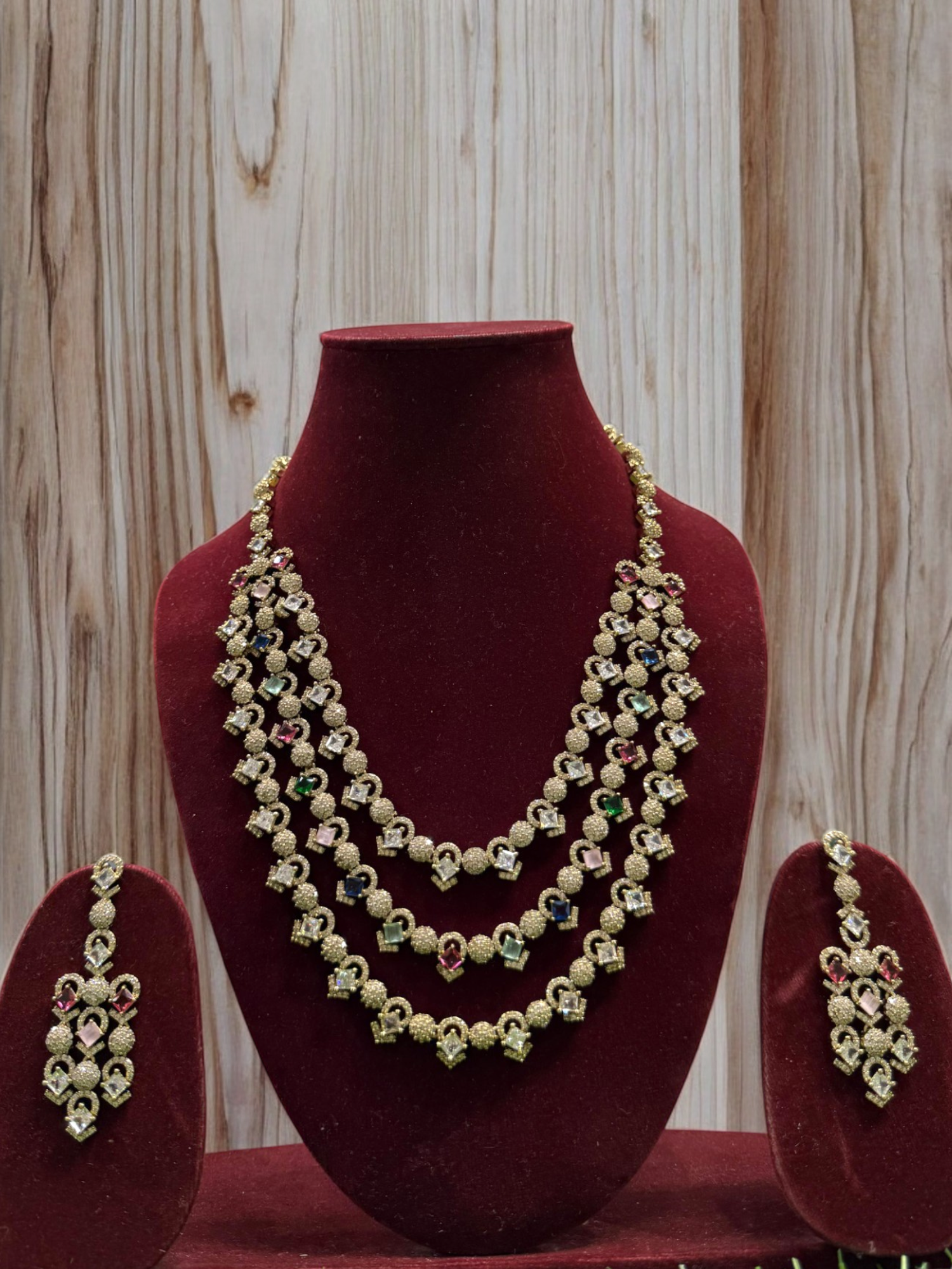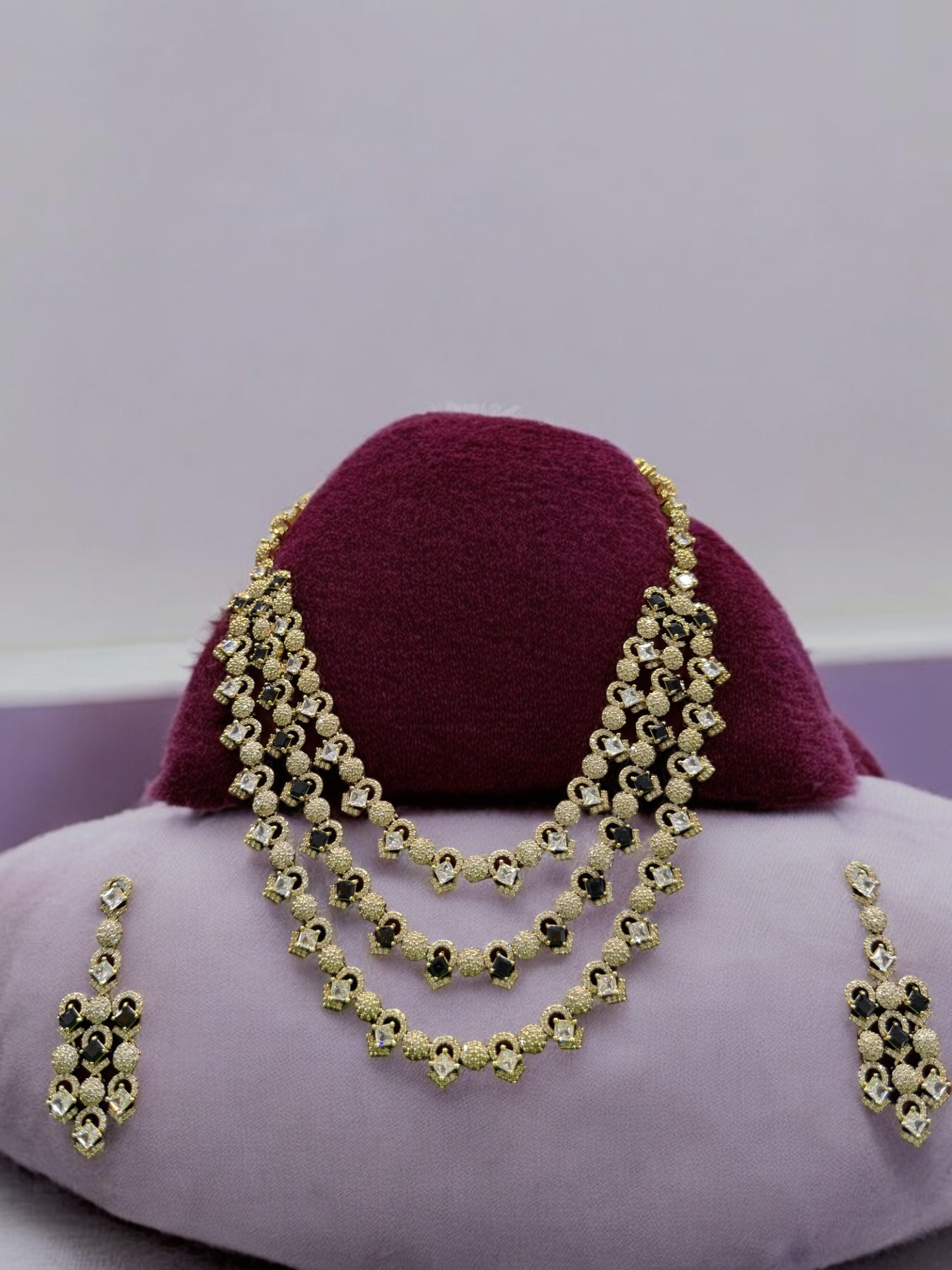 Rajsthani Golden Multi Layer Kundan Necklace Earrings Set, Jaipuri Golden Layered Pearl Necklace Set, Indian Gold Layered Kundan Jewelry Set, Indian Kundan Necklace Set