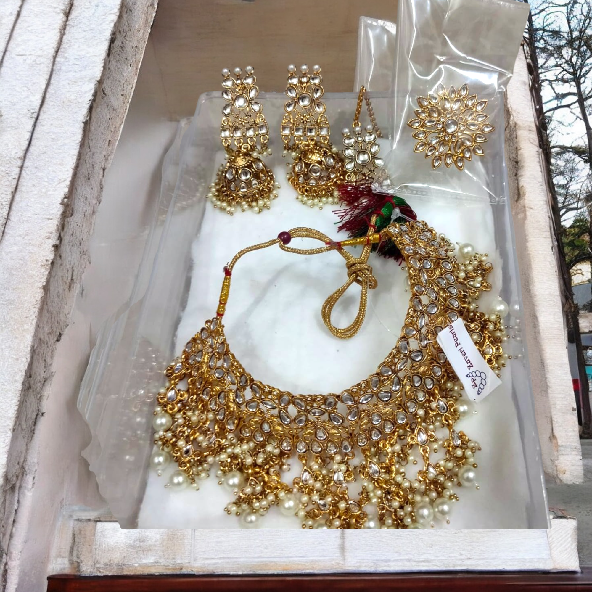 Bollywood Inspired Pearl Kundan Choker Jhumki Ring Maantika Set, Choker Set, Indian Jhumki Set, Bridal Ring, Indian Bridal Maantika Set, Pakistani Earring Jewelry Set Bridal Wedding full jewellery Set
