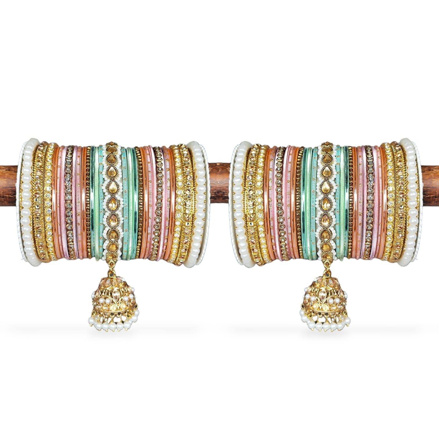 Pink & Mint Bridal Jhumki Bangles Set, Stones Pearl work, Wedding bangles, Indian Jewelry, Bridal Bangles Wedding Navratri Bollywood Bangles