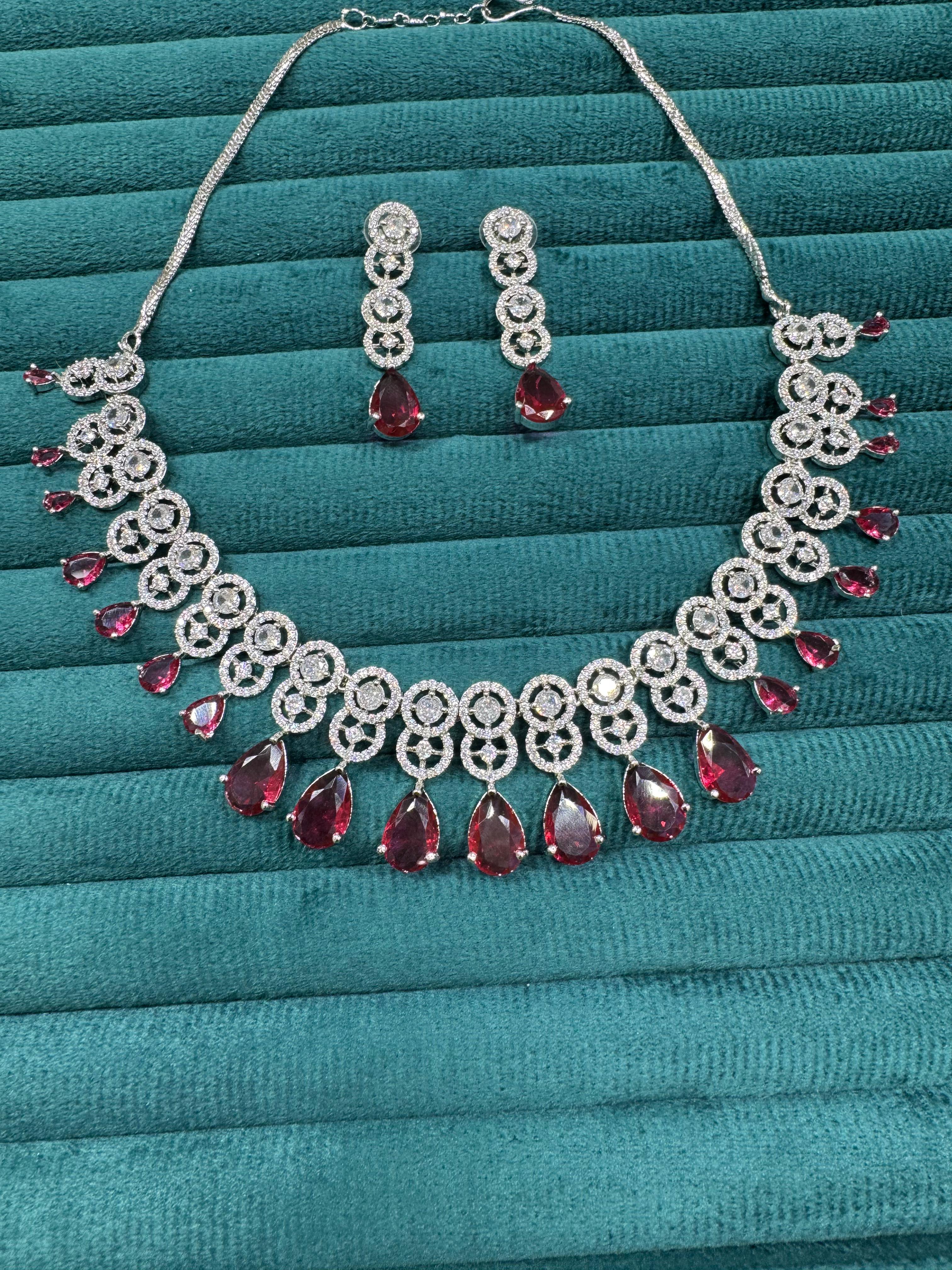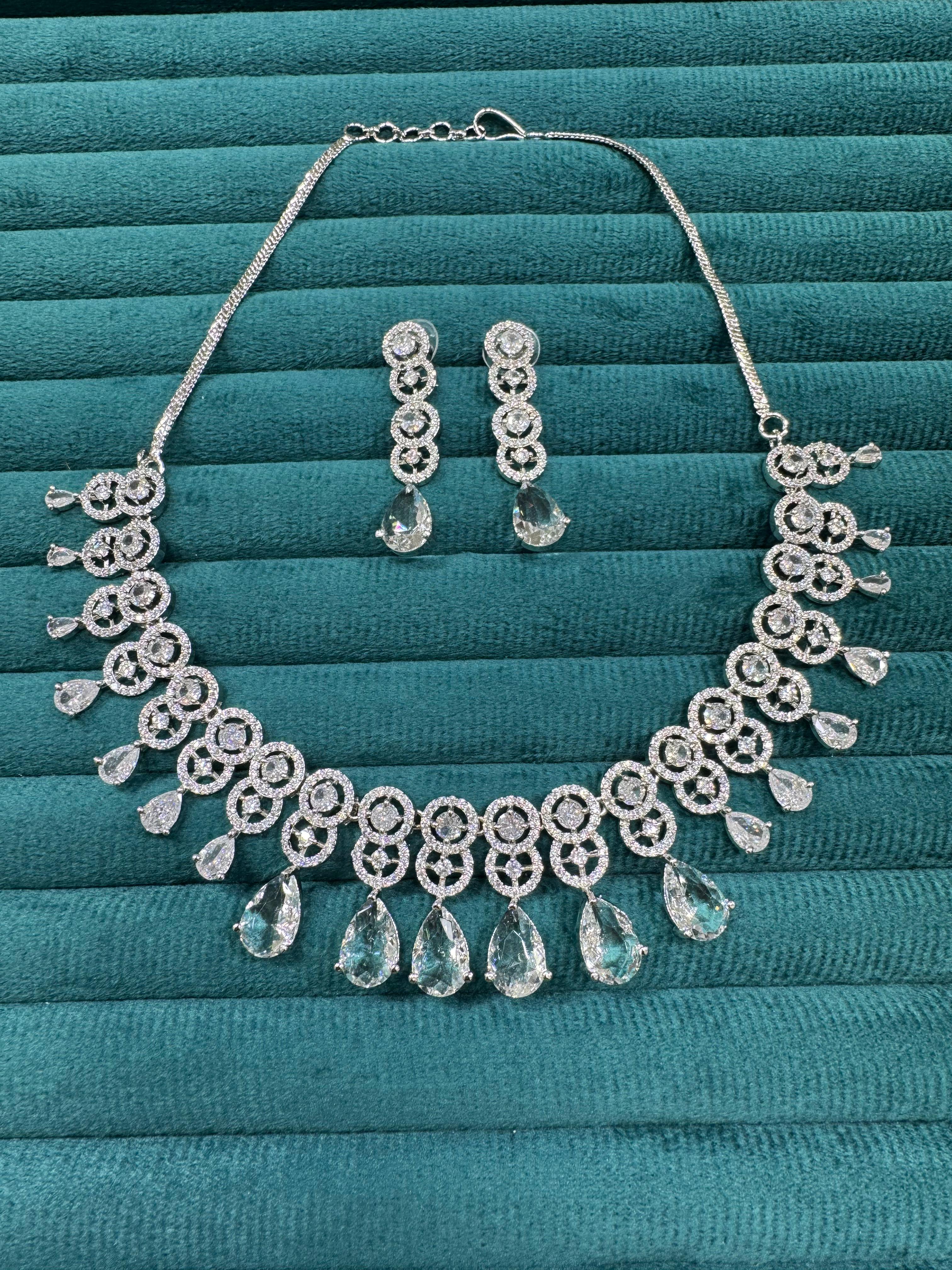 Bollywood Inspired AD Teardrop Silver Plated Necklace Set
