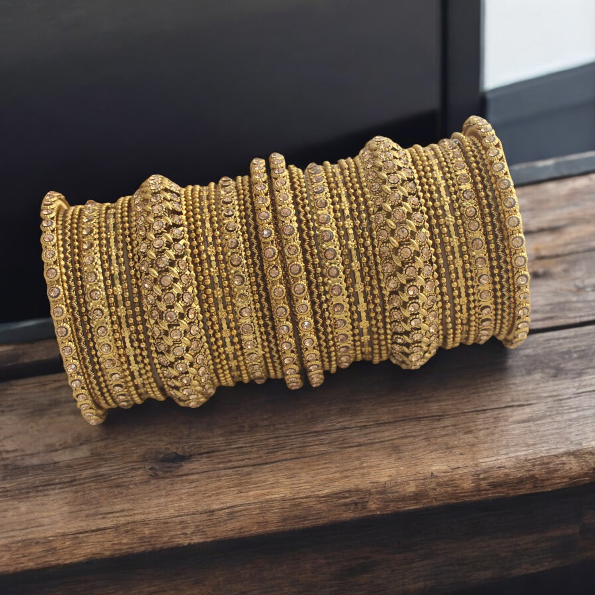 Perfect for brides or women attending special events, this bangle set adds a sense of regality and timeless charm. Its fusion of Indian and Pakistani aesthetics with Bollywood glamour ensures that the wearer shines effortlessly at any celebration, making it a must-have in any jewelry collection.