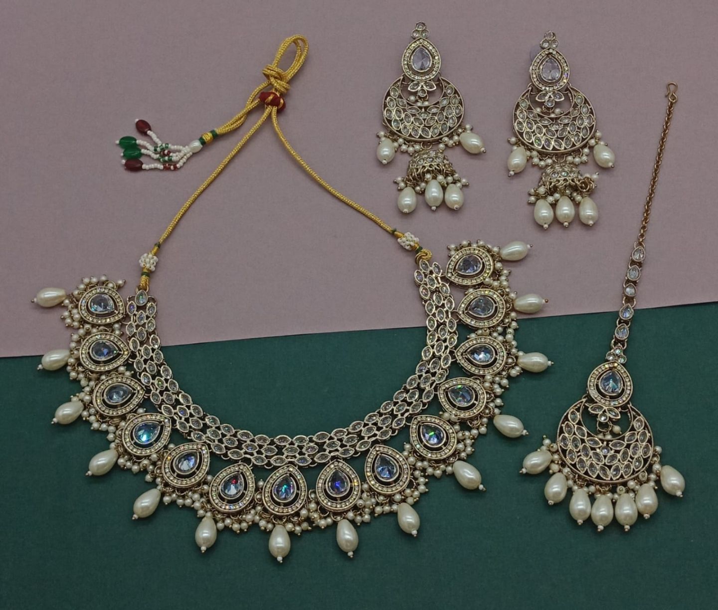 kundan pearl necklace earrings tikka, kundan necklace set, kundan jewelry set, uncut kundan choker, pachi kundan set punjabi jewelry