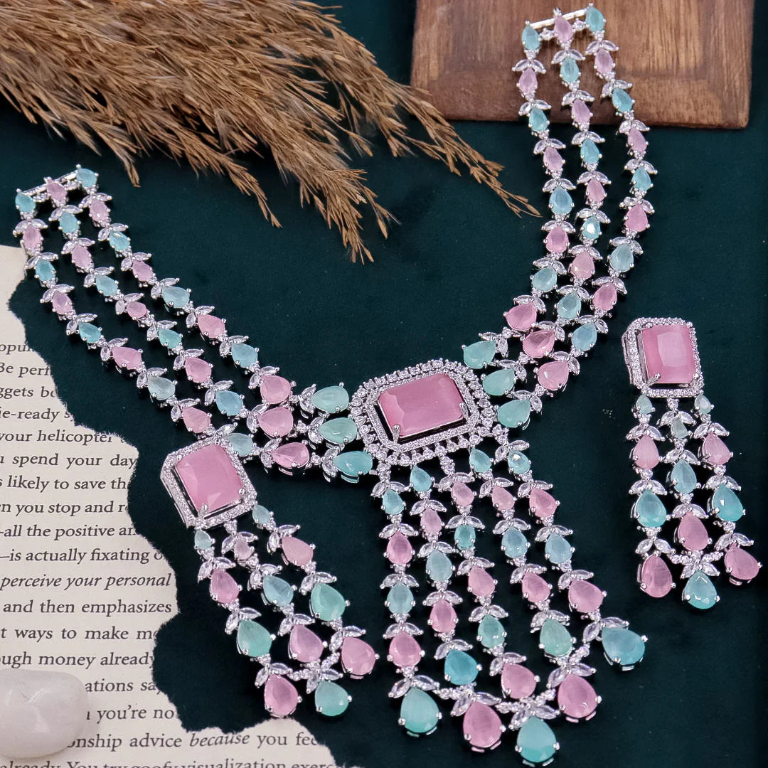 Premium Quality silver white clear stones Necklace set, Bridal jewellery, Cz American diamond necklace and earrings