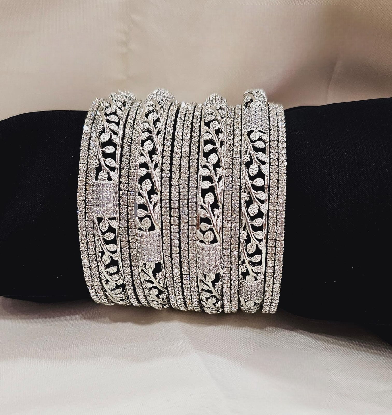This luxurious 16-piece AD bangles set features a beautifully crafted design embellished with high-quality American Diamonds. The intricate leaf pattern combined with sparkling round motifs gives the bangles a rich and elegant look. Perfect for brides, weddings, festive wear, and special occasions, this full-stack set adds instant glamour to any outfit.